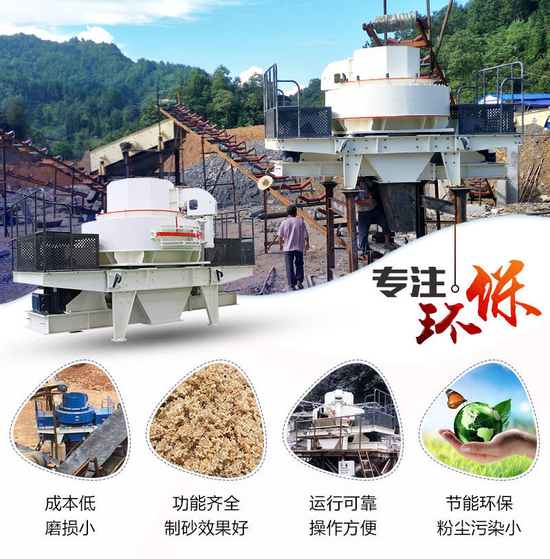 该设备拥有两种制砂原理,石打石与石打铁两种型式,"石打石"型用于磨蚀性强的物料加工;"石打铁"型用于磨蚀性不强的物料加工,对于此点优势其它制砂设备是不具有。整个过程灰尘污染率低,设备一直坚持环保新理念。